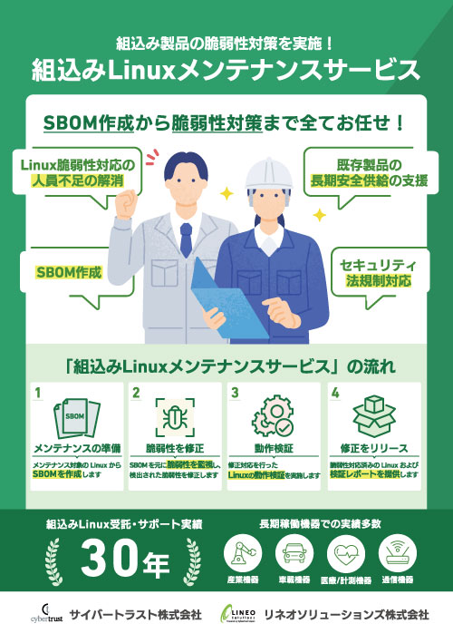 組込み Linux メンテナンスサービスは、お客様の組込み Linux 製品の長期的な脆弱性対応を支援するメンテナンスサービスです。