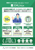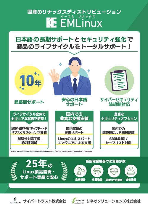 EMLinux はミッションクリティカル分野で確実な動作実績と長期間の運用実績を持つ、IoT・組込み用 Linux 開発環境です。 脆弱性の修正パッチを 10 年間提供し、欧州 サイバーレジリエンス法をはじめとする各国のセキュリティ法規制・規格に対応を支援します。 EMLinux では、IoT・組込み機器の開発に必須となるソフトウェアパッケージが標準で提供されるため、お客様は独自開発部分に注力することが可能です。