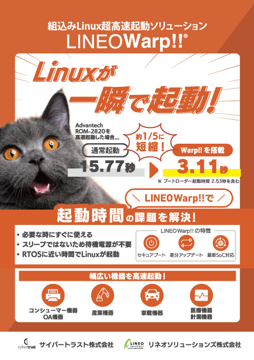 LINEOWarp!! は組込み Linux/Android を搭載する機器向けの各種 SoC に対応した超高速起動ソリューションです。