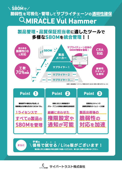 Miracle Vul Hammer は、SBOM を利用して、システムに関連する脆弱性を可視化する脆弱性管理ツールです。